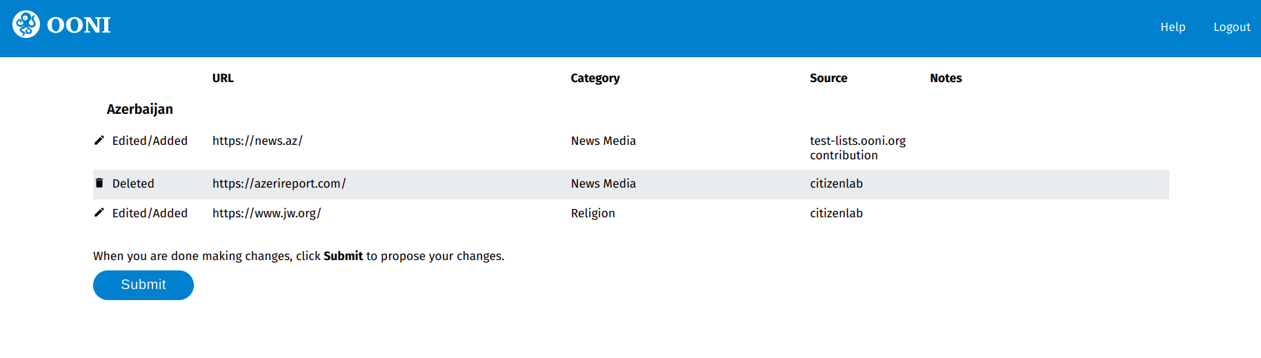 To enable our broader community to more easily review and contribute to test lists, we have created a new Test Lists Editor. This platform includes all of the Citizen Lab test lists, and users can add URLs, edit existing entries, and propose the removal of entries through a web interface (without using GitHub). User contributions (submitted through the Test Lists Editor) automatically end up as pull requests on GitHub, which are peer-reviewed by the Citizen Lab, OONI, Censored Planet, and Netalitica. Once these pull requests are reviewed and merged, the contributions are integrated into test lists and (automatically) prioritized for OONI Probe testing.