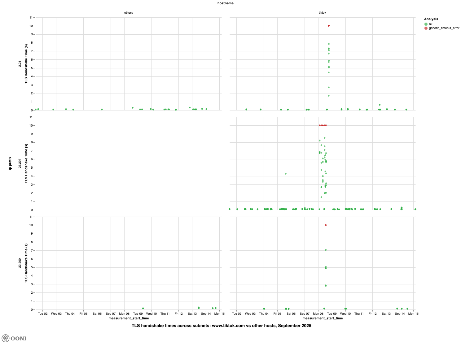 The following chart shows the TLS handshake times for www.tiktok.com across each of these IP prefixes from 1st to 15th September 2025. As evident from the data, there is a significant spike in handshake duration on 8 September 2025 across all prefixes, suggesting that access to TikTok was throttled on that day.