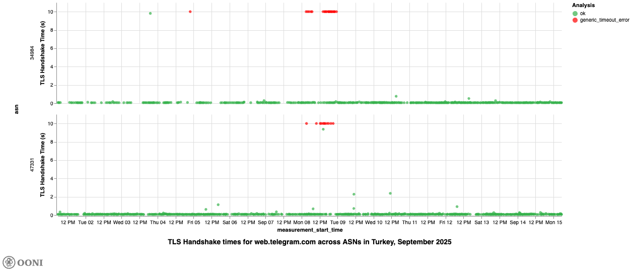 We observed the exact same pattern on 8th September 2025, when the OONI Probe testing of web.telegram.org resulted in TLS handshake timeout errors on TTNET (AS47331) and Turkcell Superonline (AS34984), suggesting that access to Telegram Web was blocked on those networks on that day.