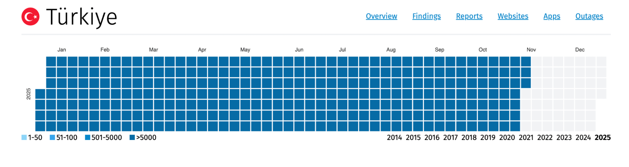 Image: OONI measurement coverage from Türkiye between 1st January 2025 to 11th November 2025 (source: OONI Explorer).