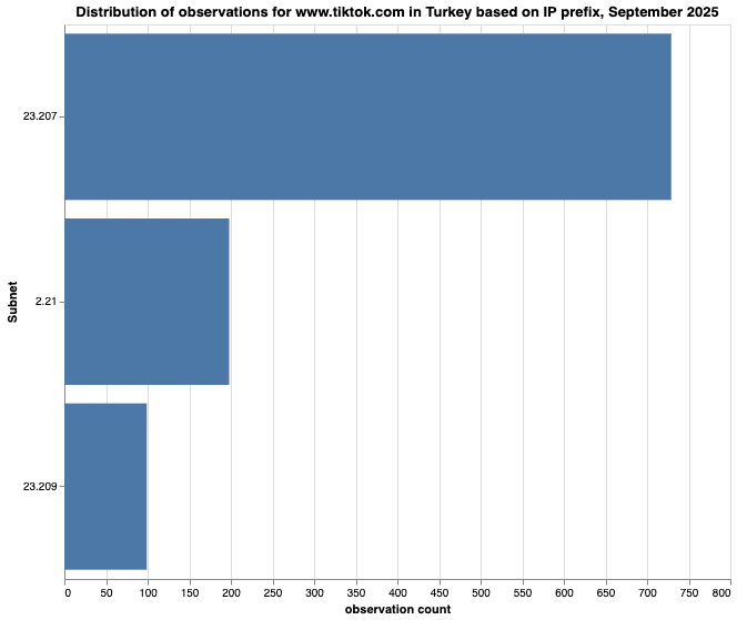 Chart: Distribution of OONI measurement observations for www.tiktok.com based on major IP prefixes in Türkiye, September 2025 (source: OONI data).