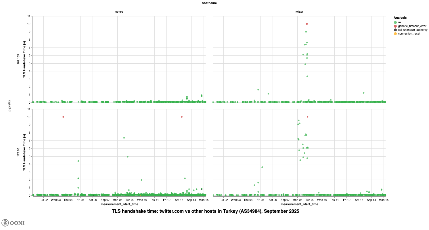 Chart: Distribution of TLS handshake times for twitter.com across major IP prefixes on AS47331 and AS34984 in Türkiye from 1st to 15th September 2025 (source: OONI data).