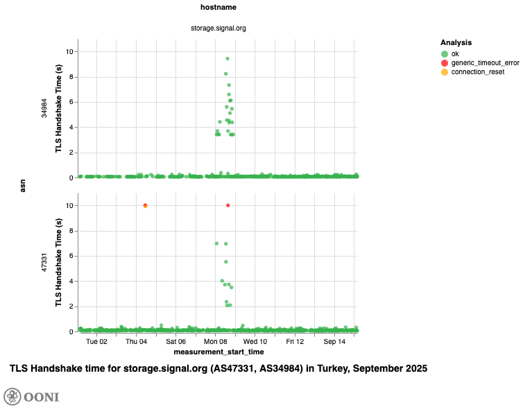 storage.signal.orgwere significantly longer than for 20 other hostnames sharing the same IP prefixes during the same period, OONI data suggests that access to Signal was throttled on TTNET (AS47331) and Turkcell Superonline (AS34984) in Türkiye. While OONI data indicates throttling on 19th and 20th March 2025, the signal is stronger on 8th September 2025.