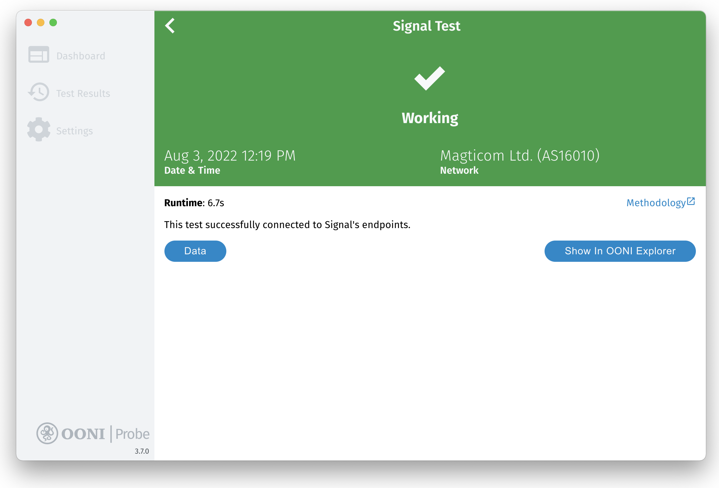 Your OONI Probe test results will automatically get published on OONI Explorer and on the OONI API.