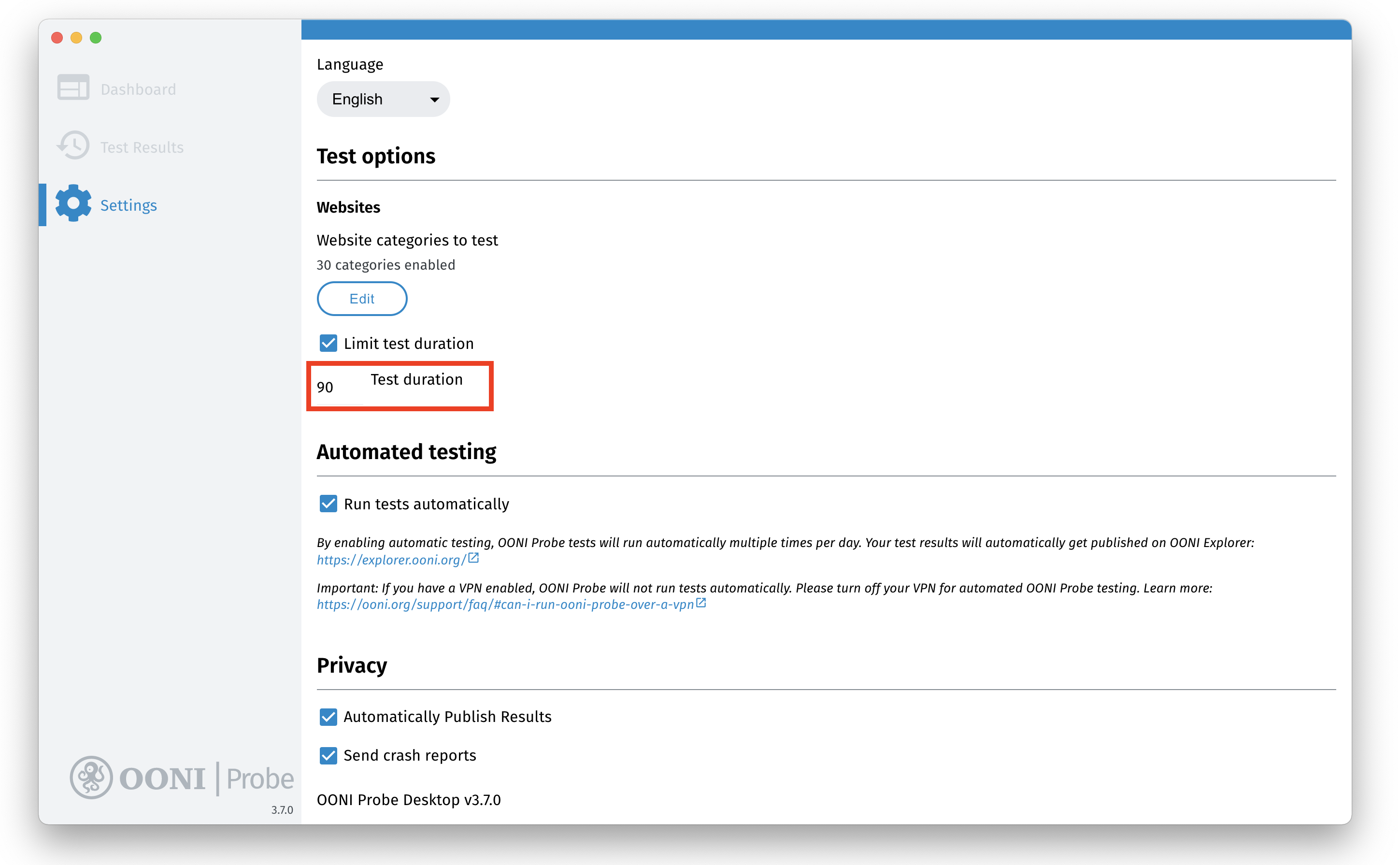 The automated OONI Probe testing settings have already been covered in previous sections of this guide. Please refer to the “Automated OONI Probe testing” section.