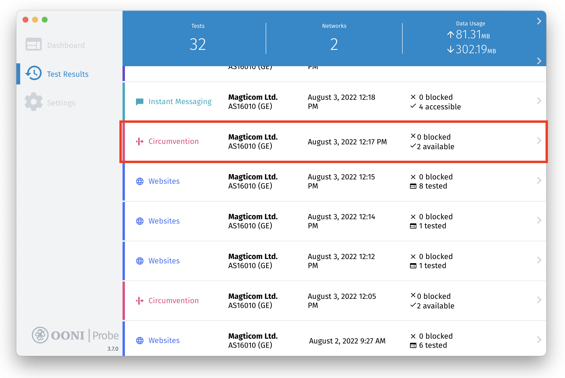 Similarly, you can access Tor test results through the circumvention results in your OONI Probe app.
