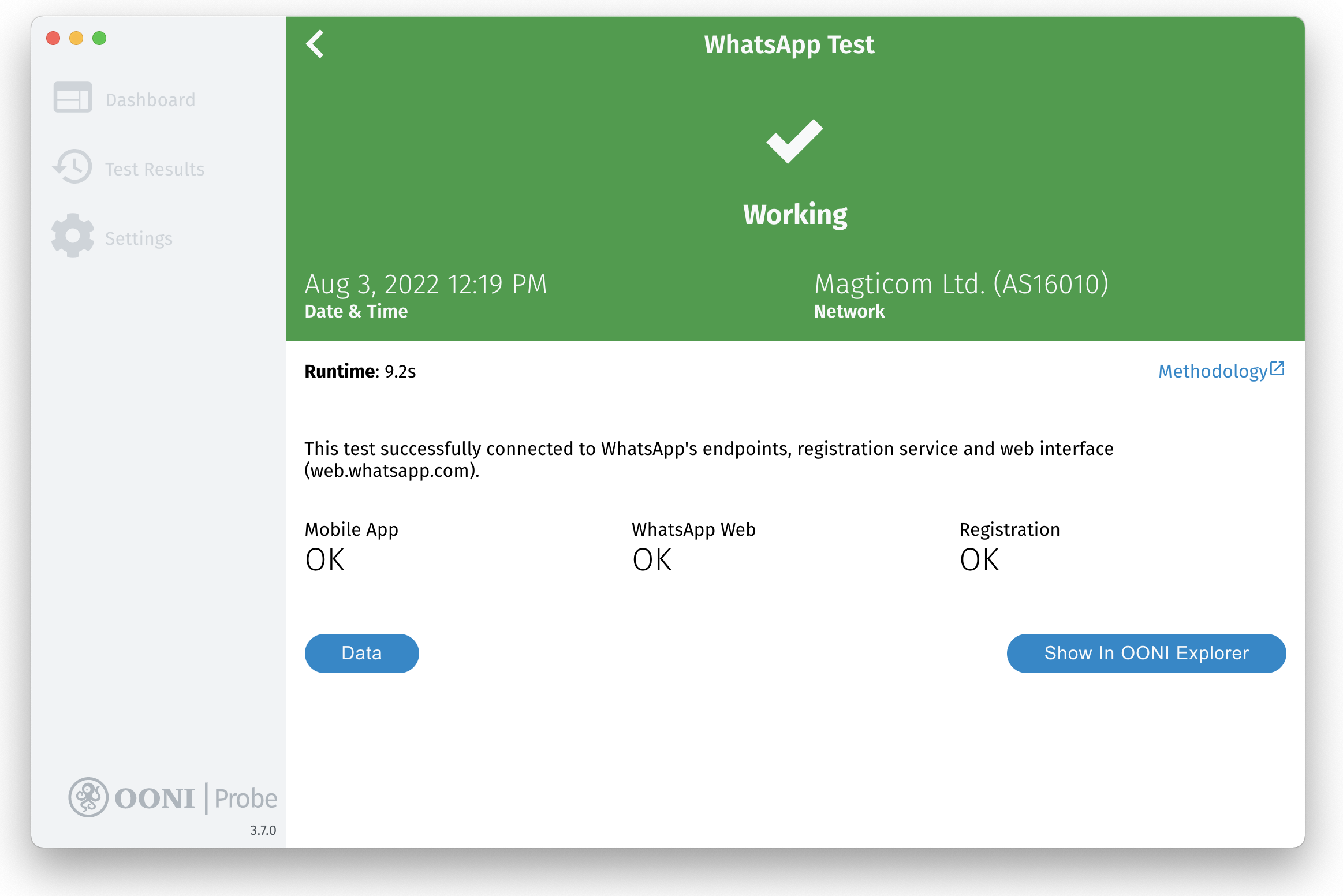 The above measurement page pertains to the testing of WhatsApp. We can see that WhatsApp was found accessible when tested on Magticom Ltd. (AS16010) on 3rd August 2022 at 12:19 local time. This conclusion is reached because OONI’s WhatsApp test was able to successfully connect to WhatsApp’s endpoints, registration service, and web interface (web.whatsapp.com).